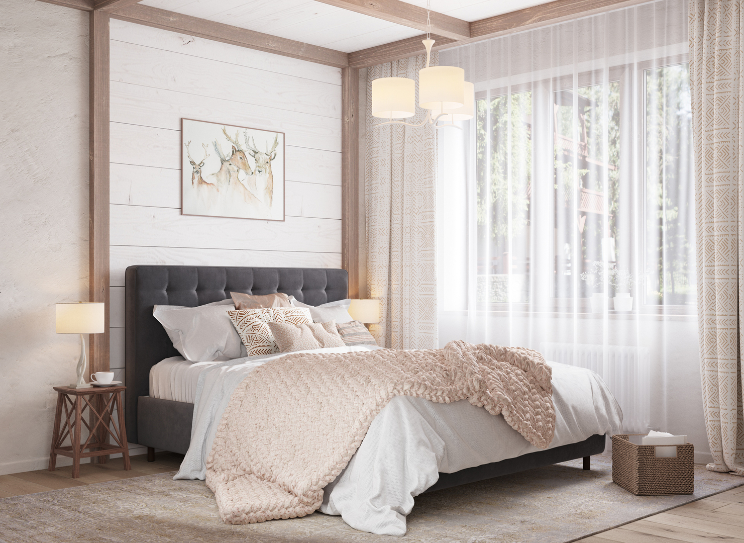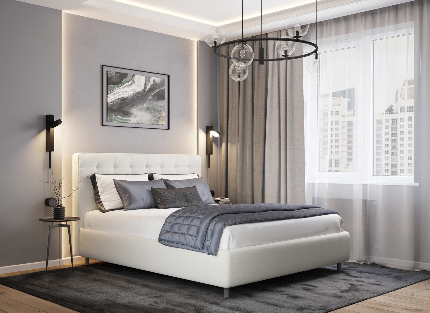 Творчески завершить образ спальни помогут дополнительные аксессуары: например, декоративные подушки-валики MOON 1165, прикроватные тумбы, банкетки, а также покрывала-саше.