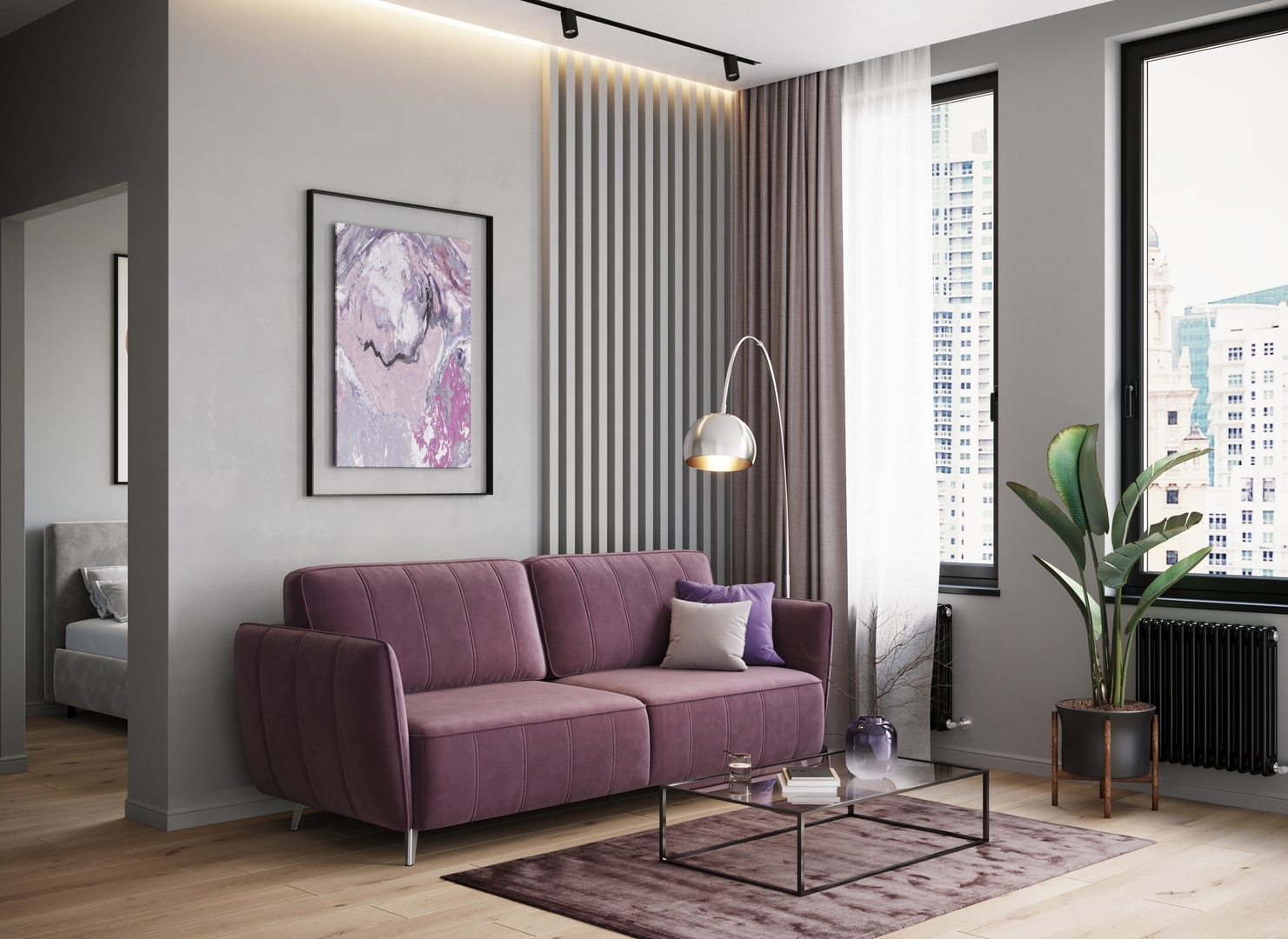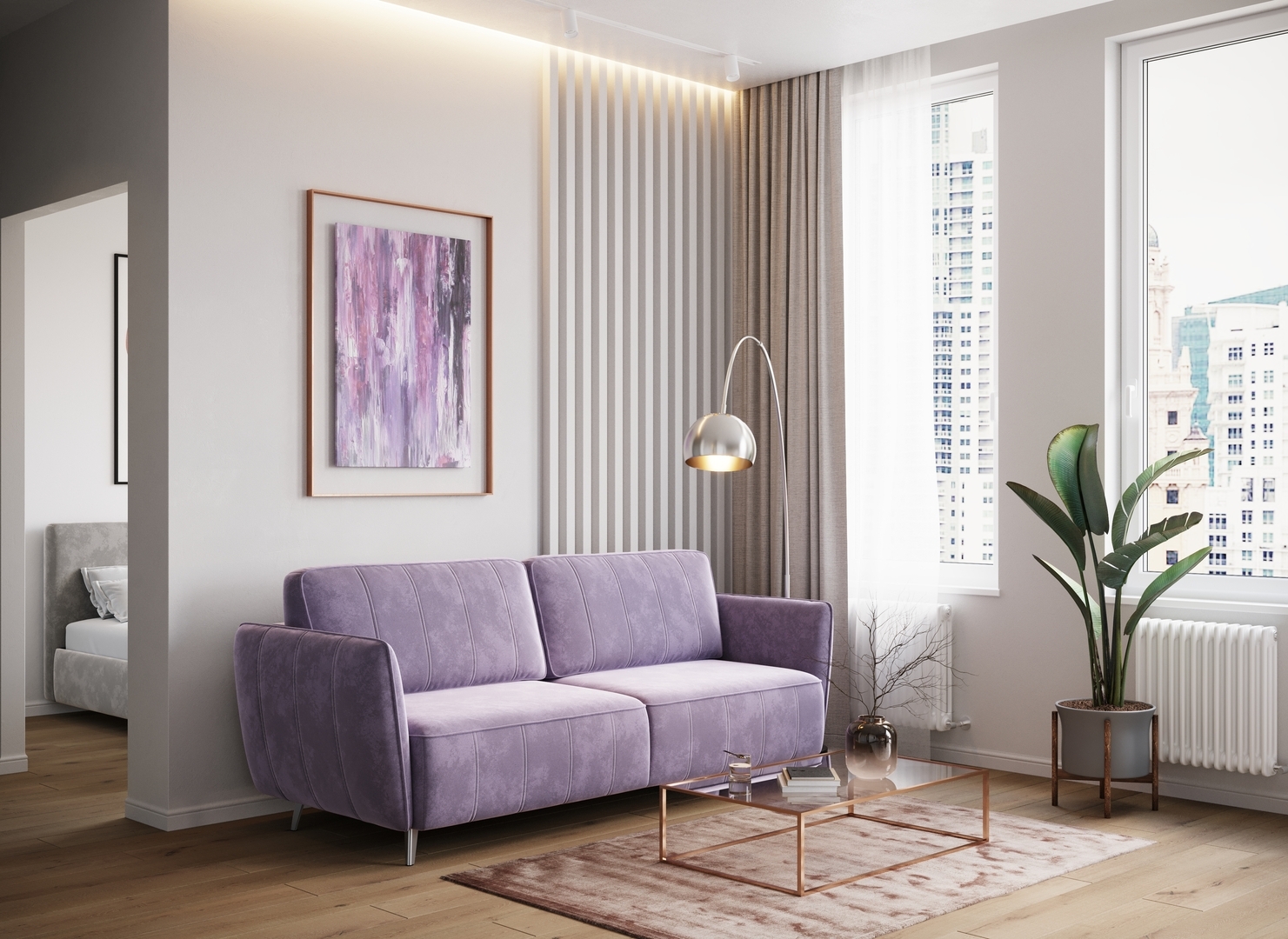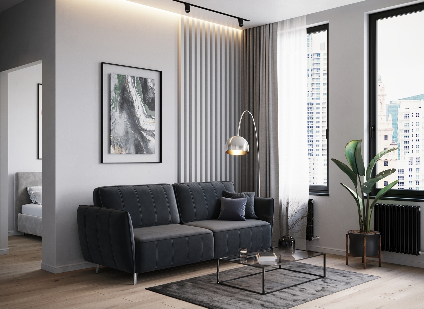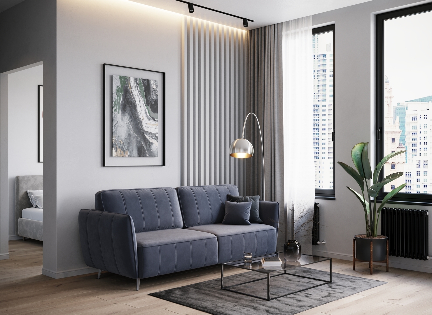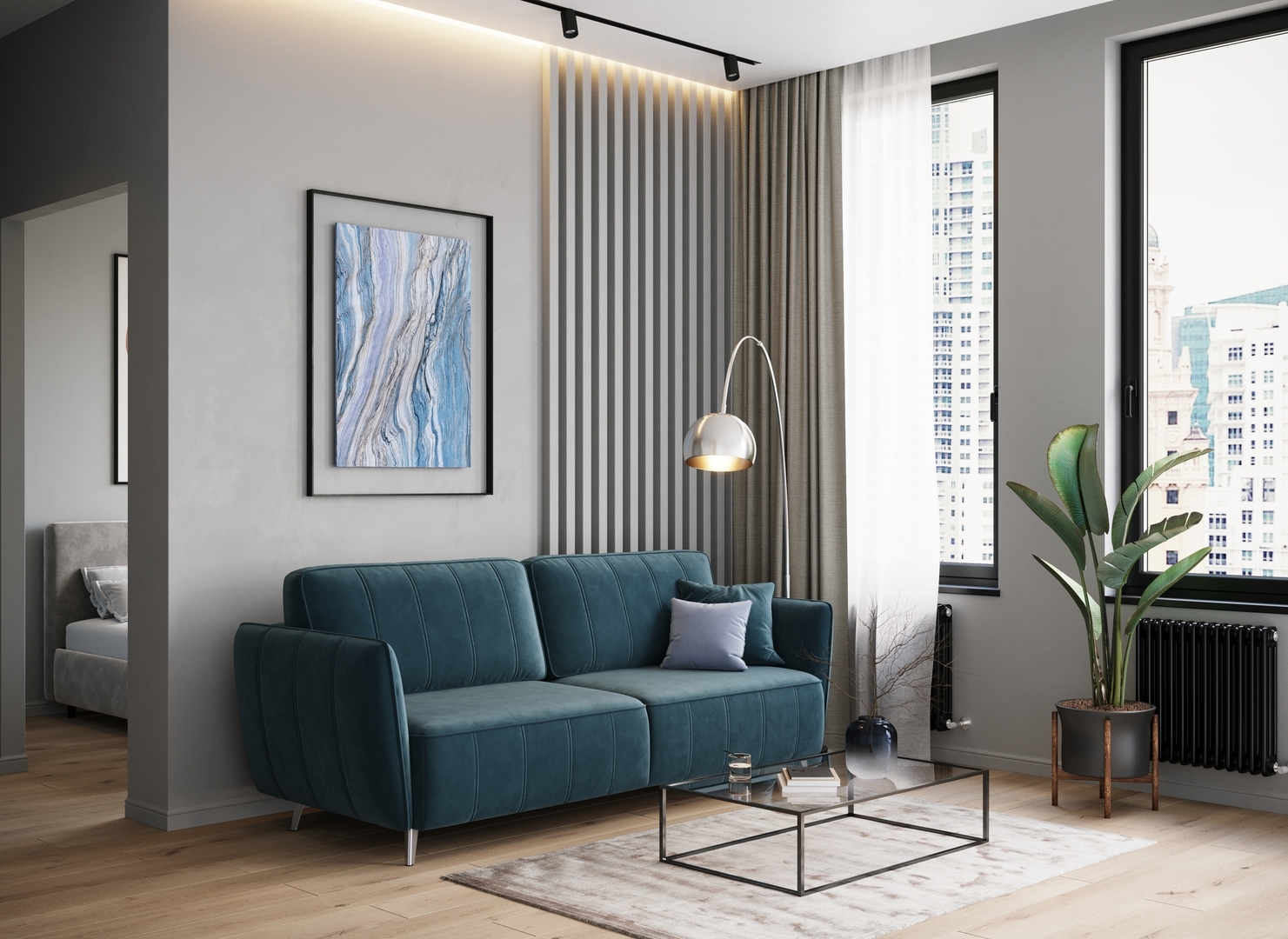 Спинка, выполненная в обивочной ткани, позволяет ставить диван в центре комнаты и зонировать пространство.