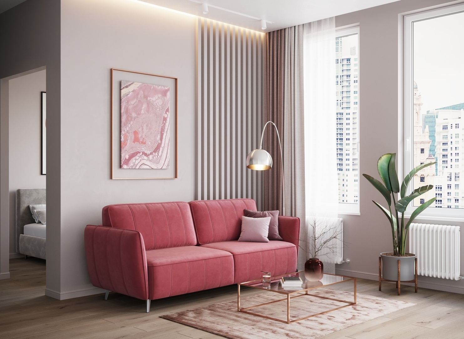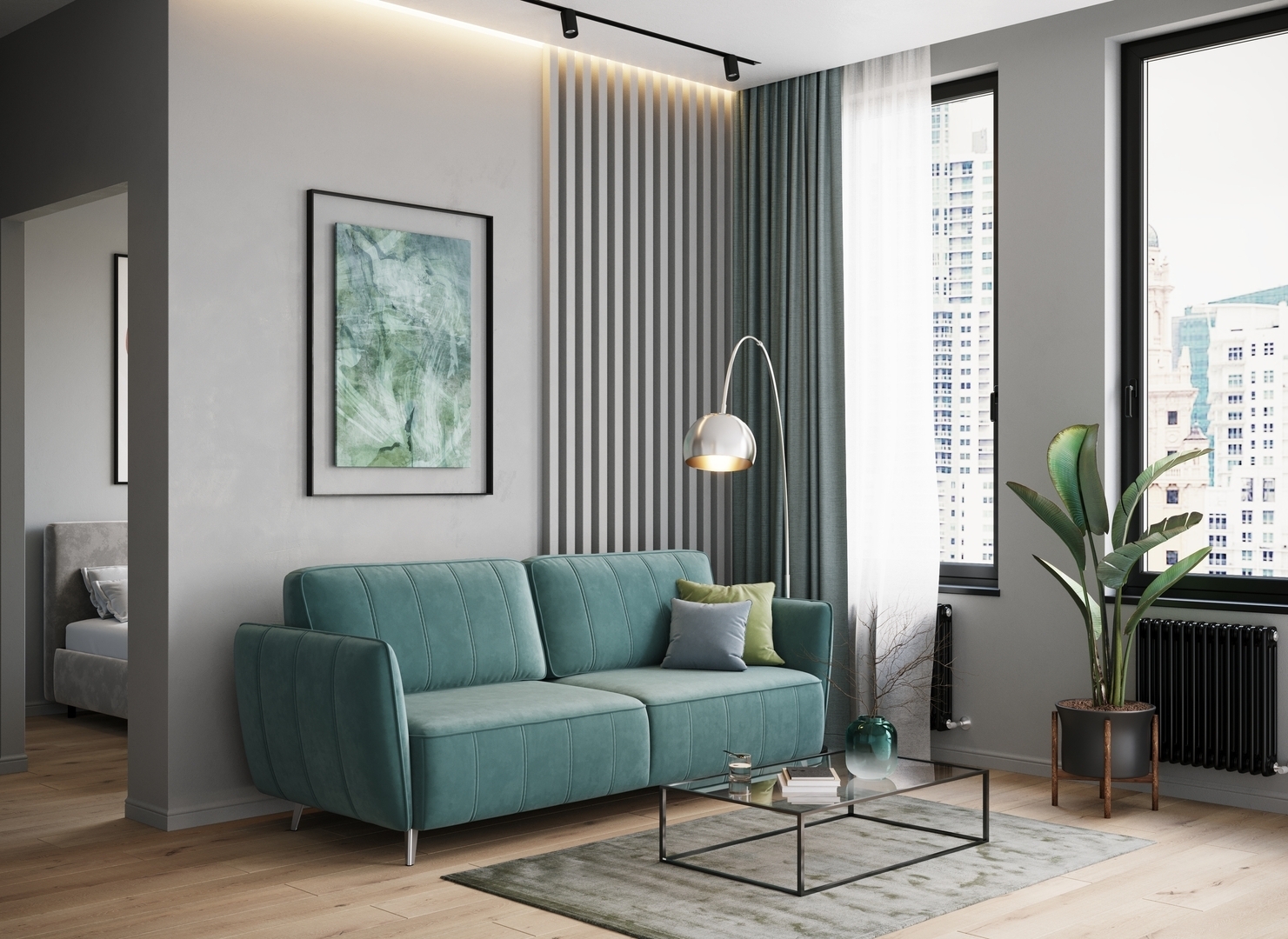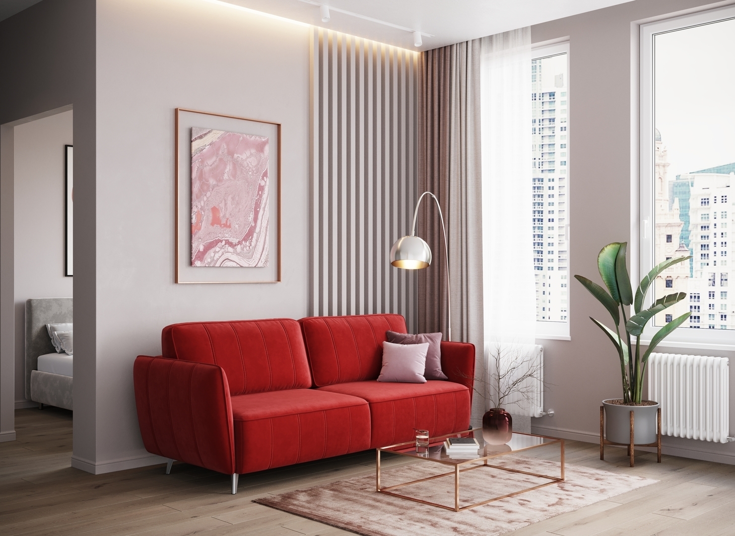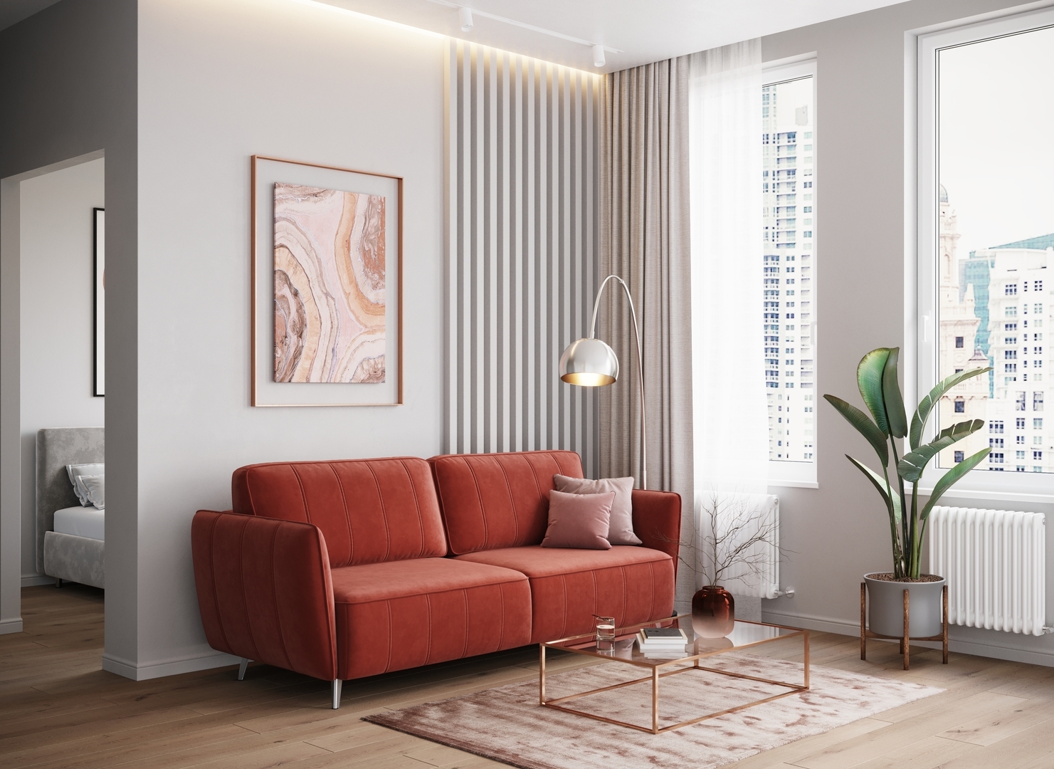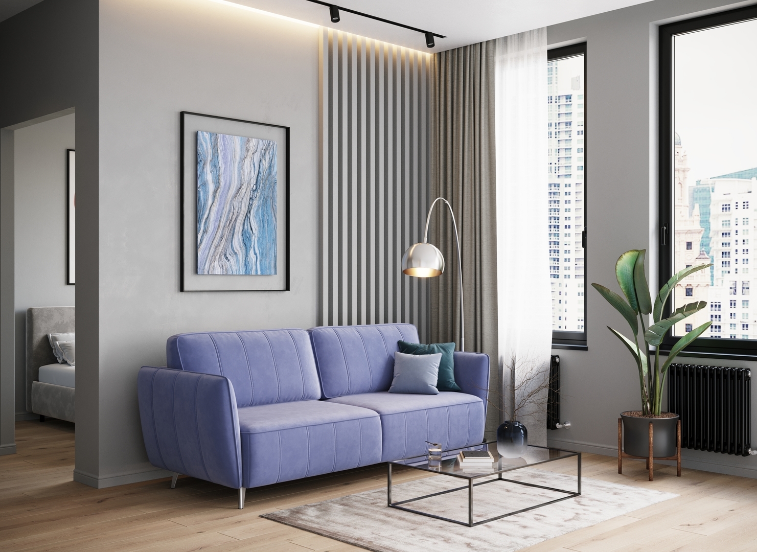 Спинка, выполненная в обивочной ткани, позволяет ставить диван в центре комнаты и зонировать пространство.