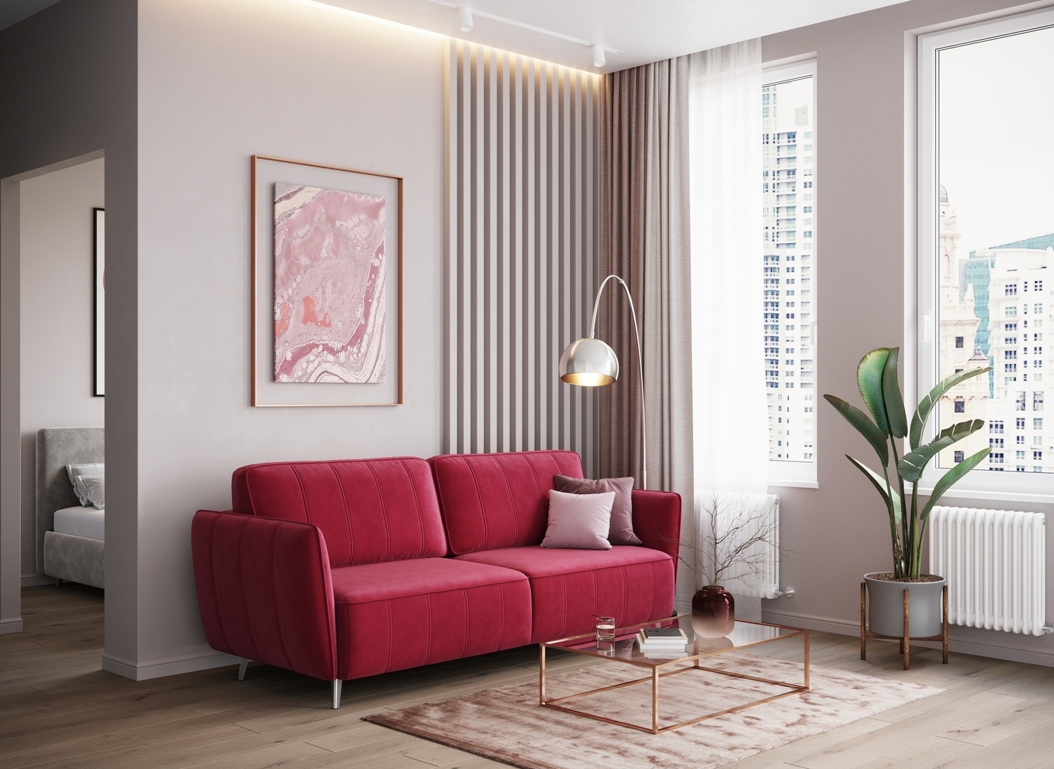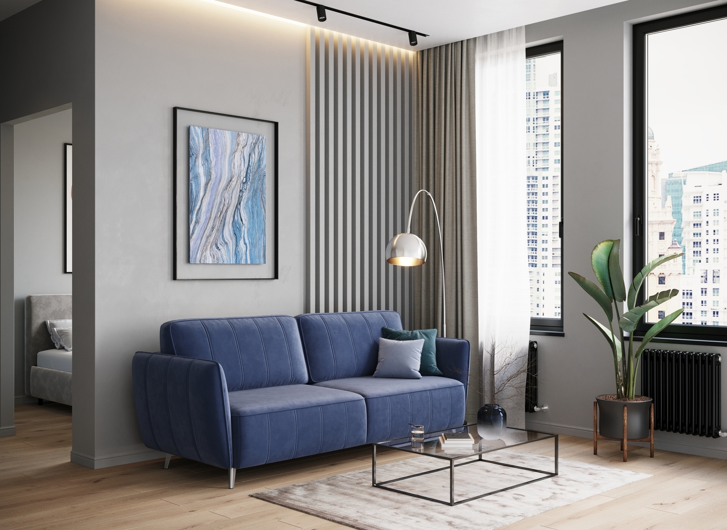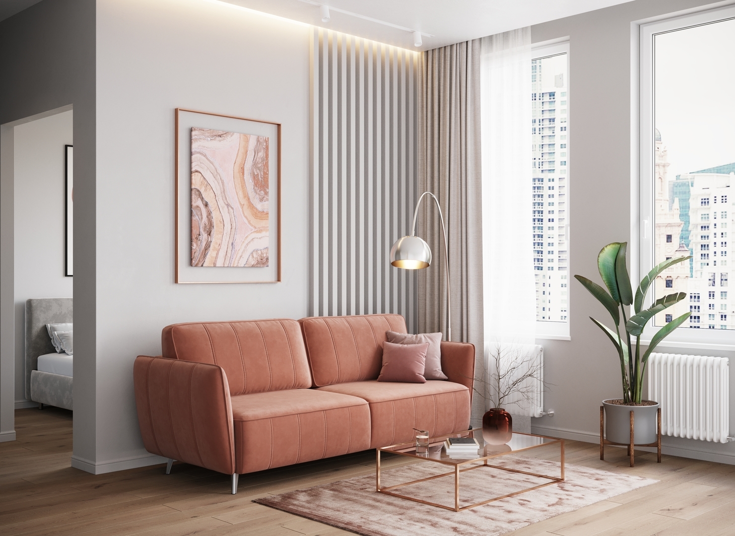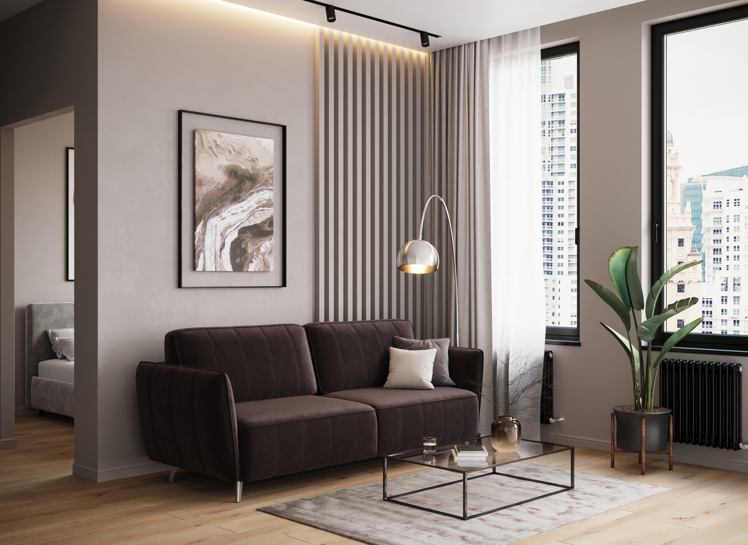 Спинка, выполненная в обивочной ткани, позволяет ставить диван в центре комнаты и зонировать пространство.