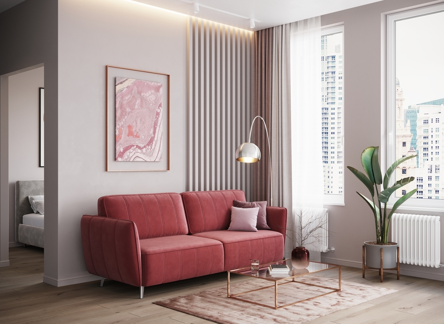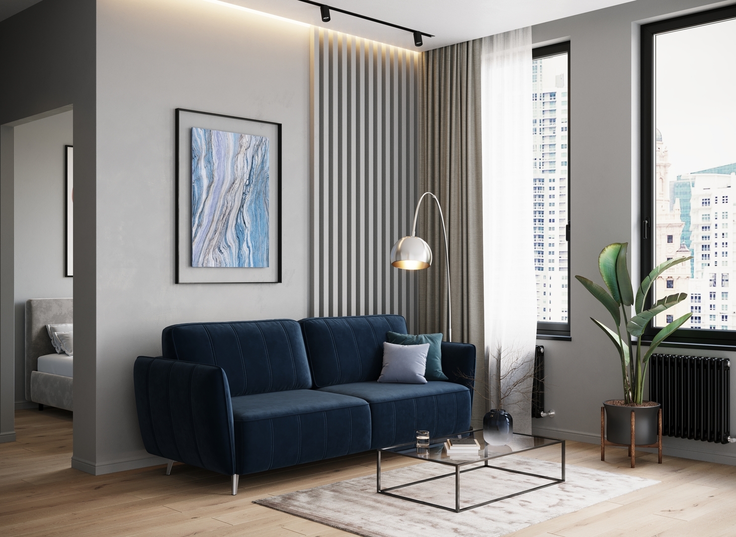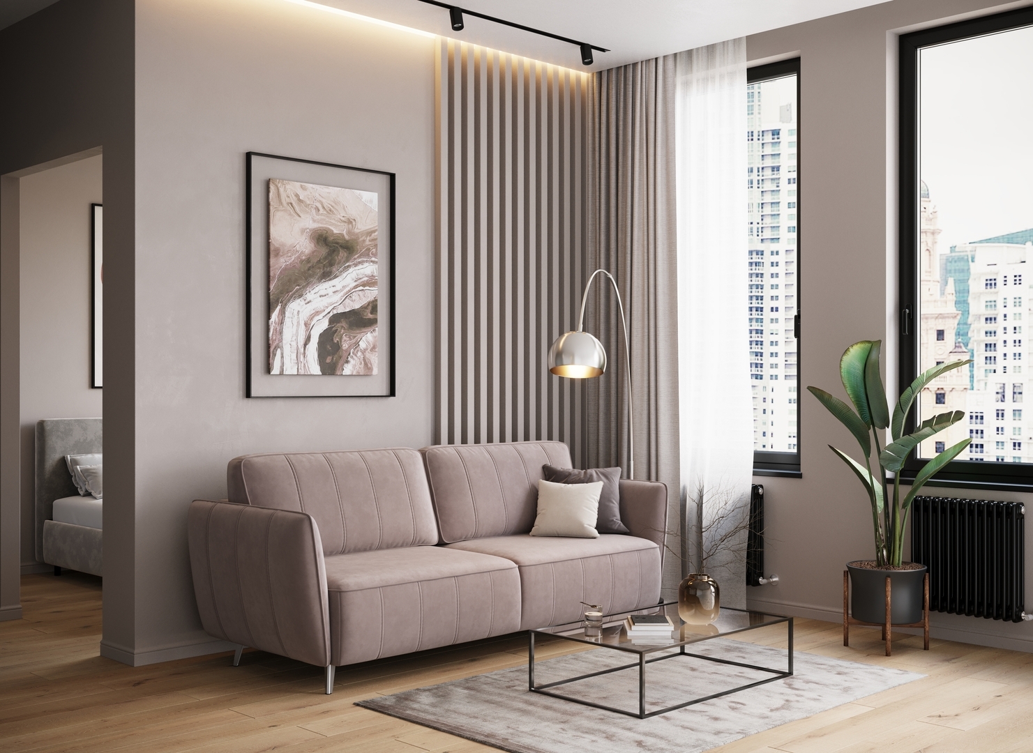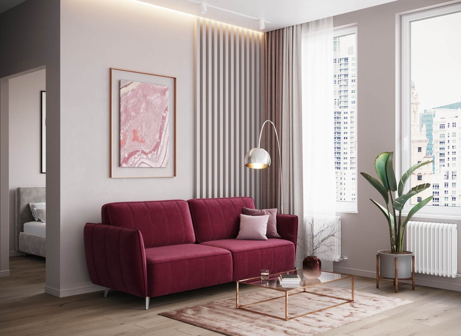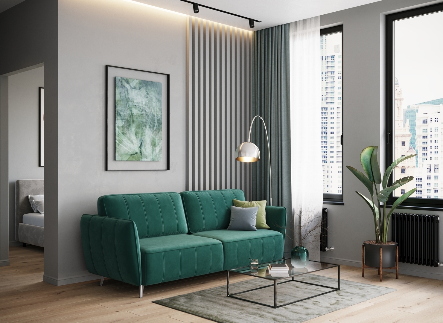 Спинка, выполненная в обивочной ткани, позволяет ставить диван в центре комнаты и зонировать пространство.