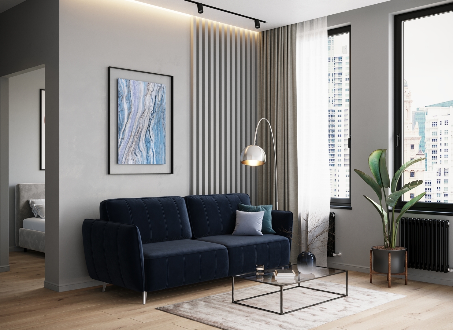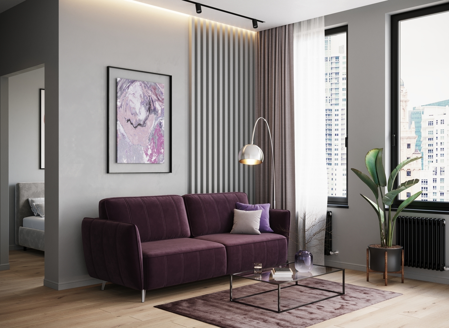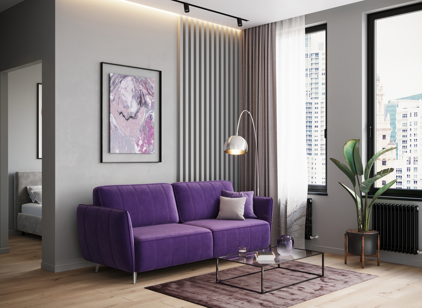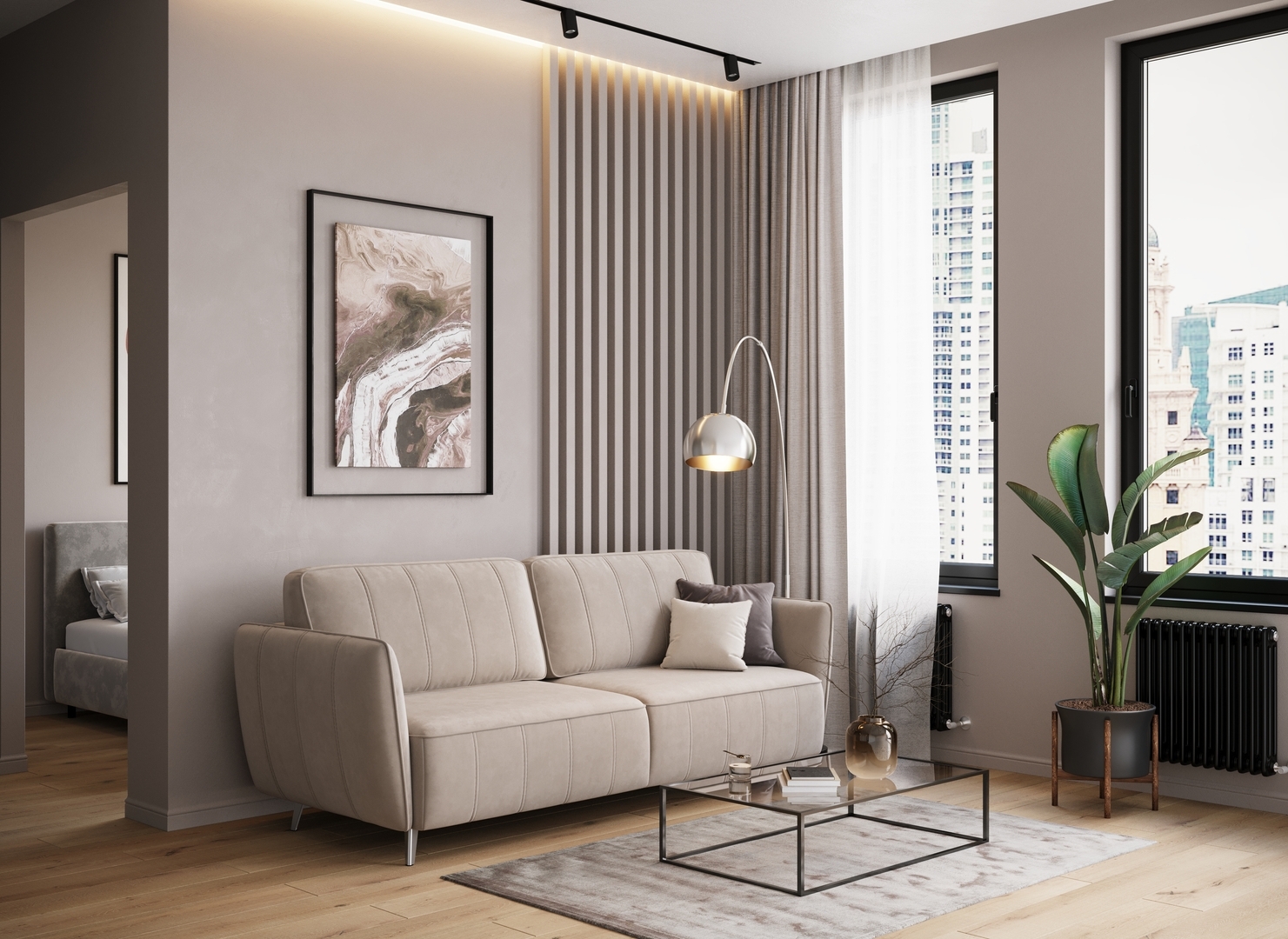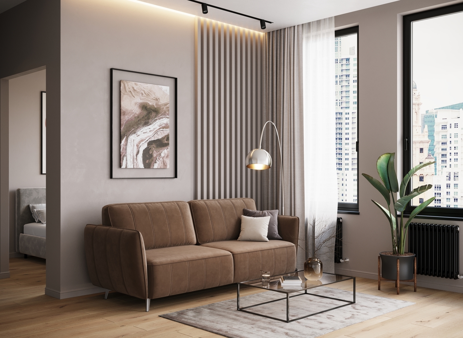 Спинка, выполненная в обивочной ткани, позволяет ставить диван в центре комнаты и зонировать пространство.