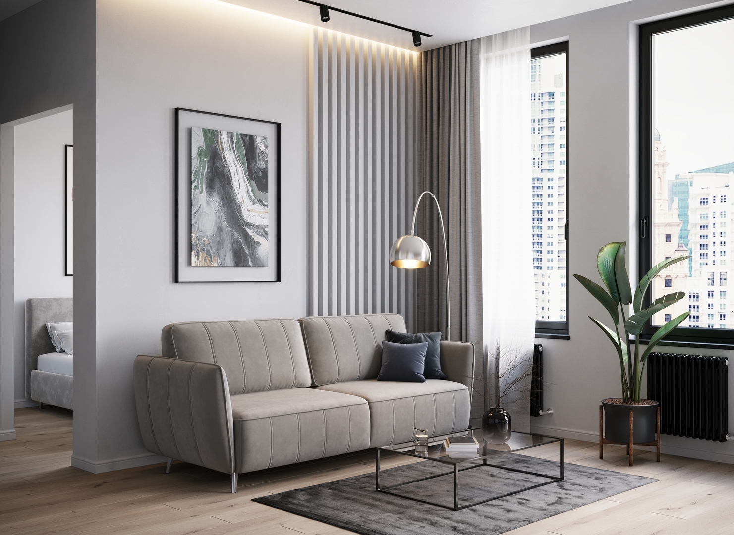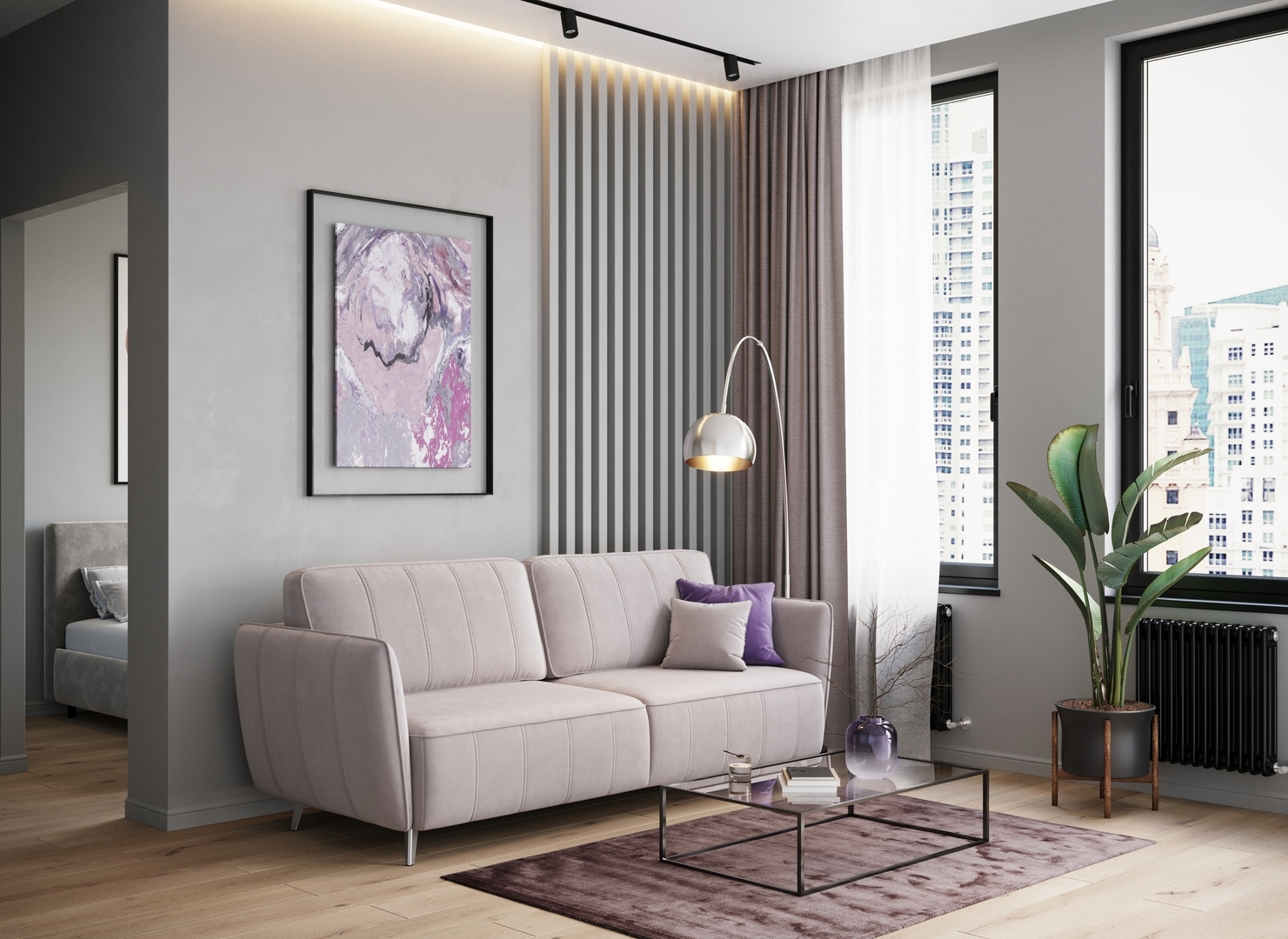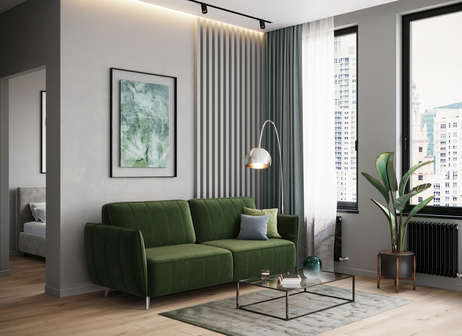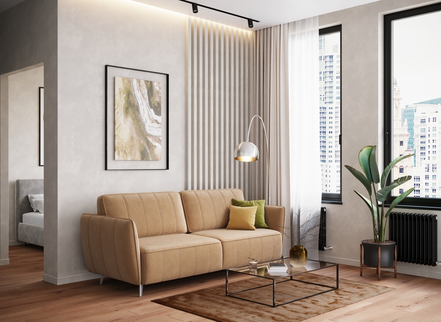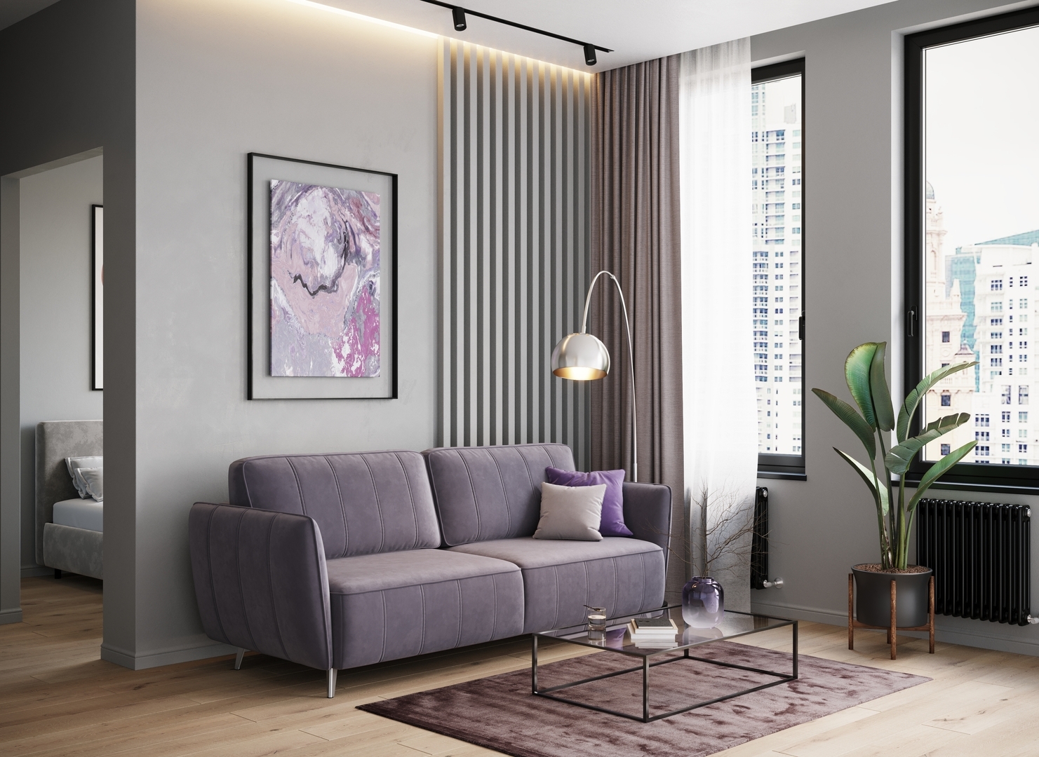 Спинка, выполненная в обивочной ткани, позволяет ставить диван в центре комнаты и зонировать пространство.