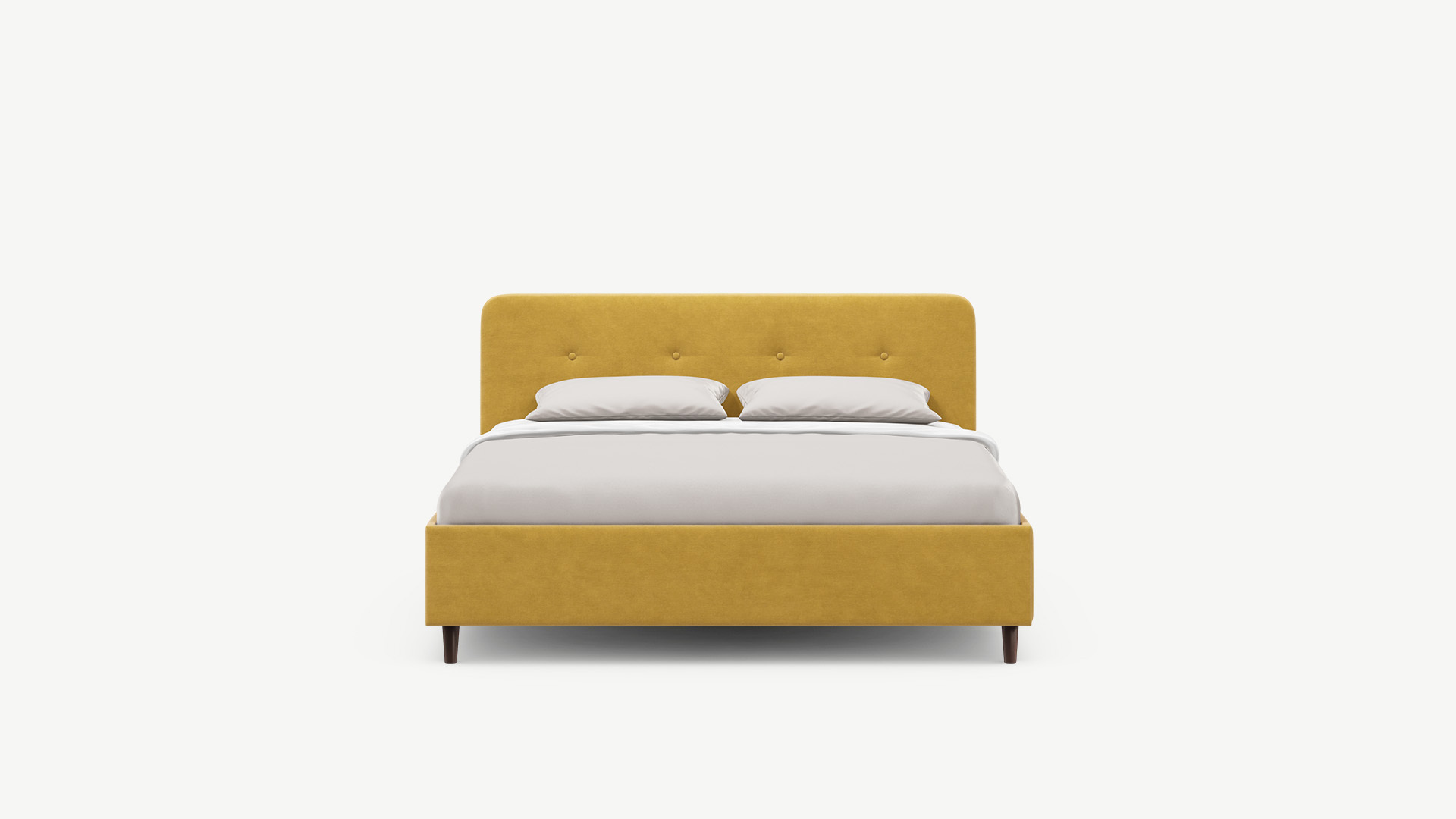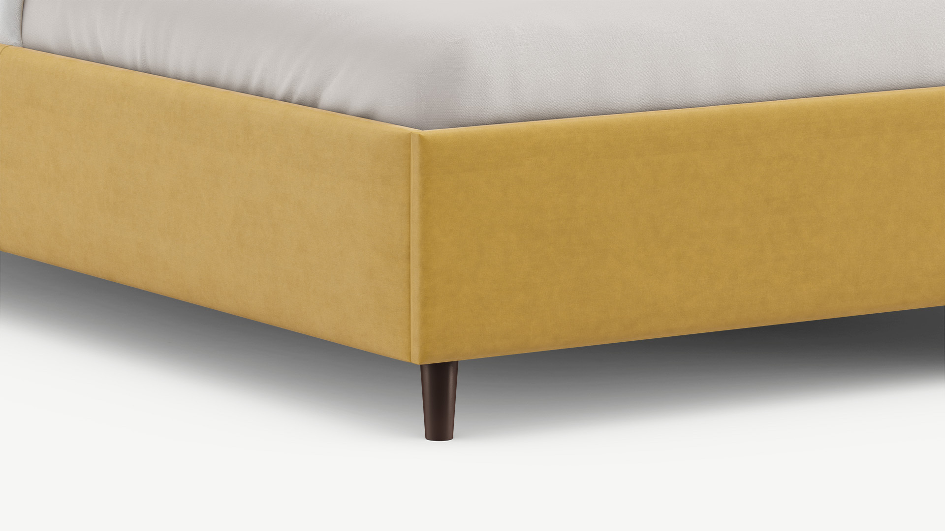 Царга, задающая пропорции, благодаря гладкости своей фактуры подчеркивает центральный элемент декора. Высокие опоры приподнимают фигуру кровати над полом и добавляют её образу визуальной легкости.