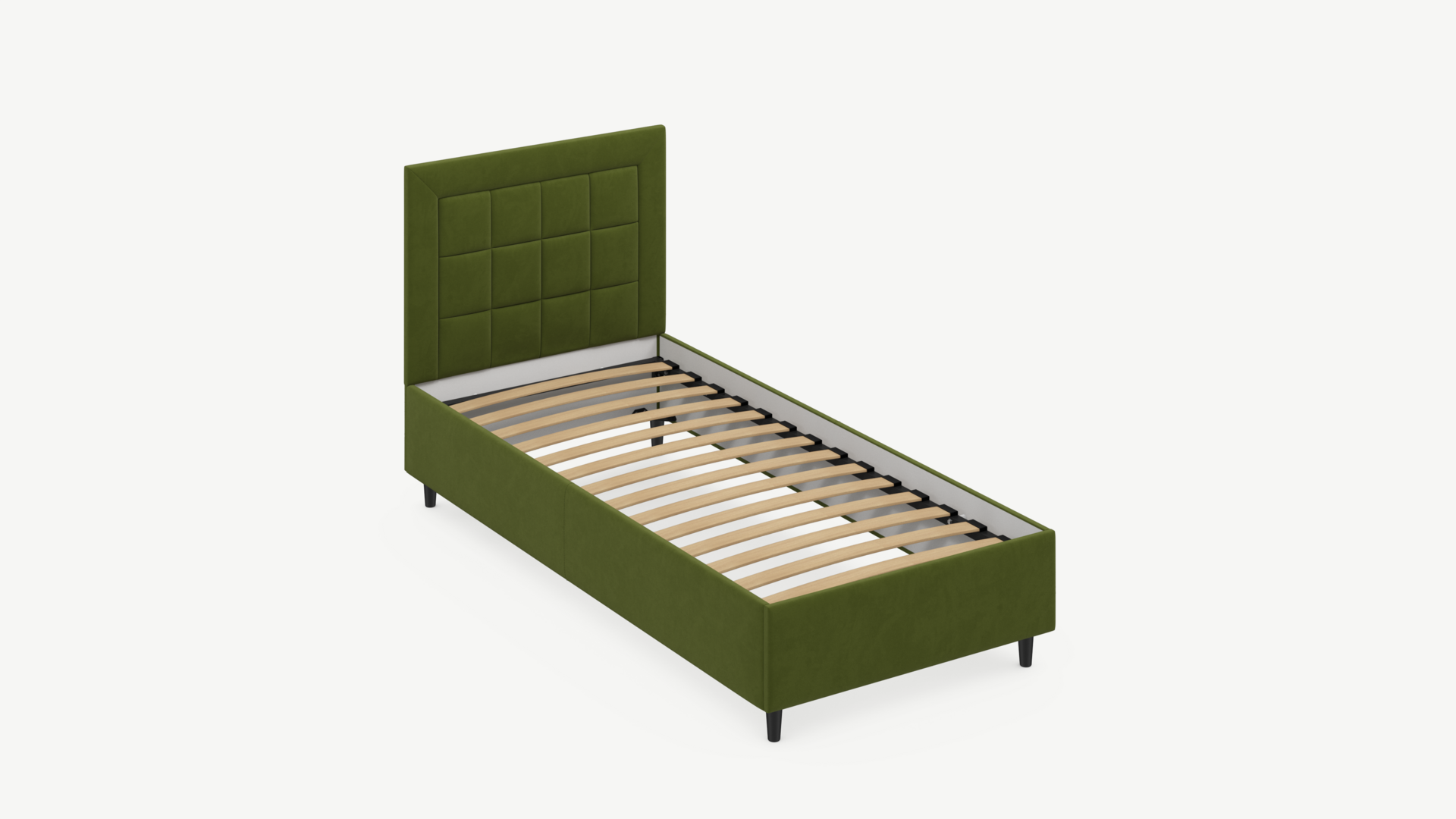 Изголовье декорировано рельефным рисунком стежки в крупный квадрат, получившим особую фактуру за счет глубины шва.