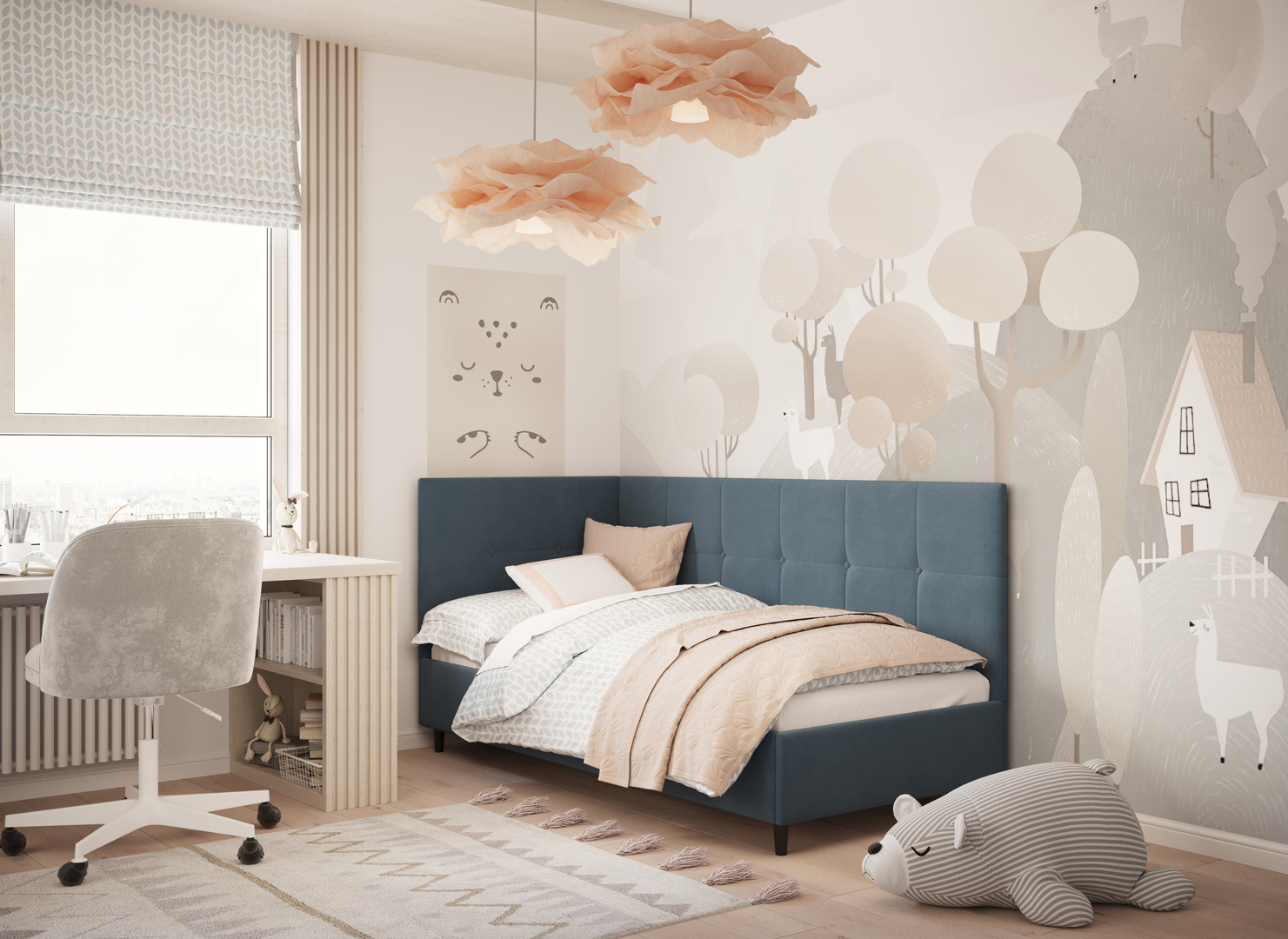 MOON FAMILY 1261 объединяет функциональность и стиль, создавая гармоничное пространство для отдыха и творчества. Кровать доступна в левостороннем и правостороннем исполнении, что позволяет легко адаптировать ее под любые интерьерные особенности.