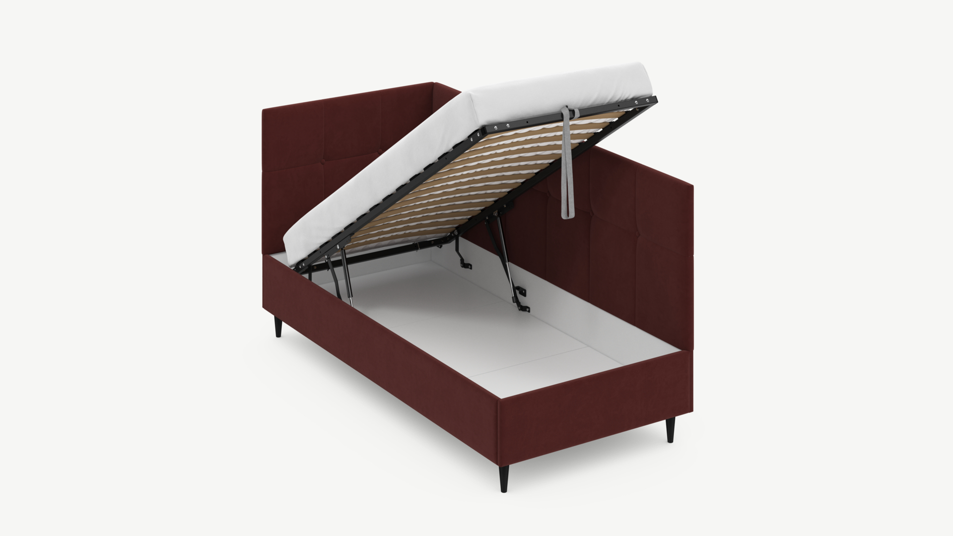 • Регулируемый подъемный механизм имеет два положения установки газовых амортизаторов в зависимости от веса матраса. Это дает возможность оптимально подстраивать угол подъема основания, а также плавно и бесшумно поднимать и опускать спальное место.