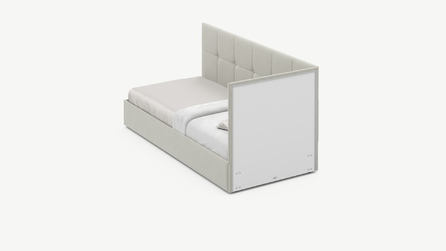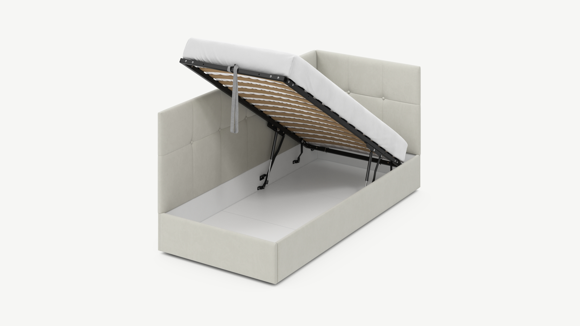 Угловая односпальная кровать MOON FAMILY 1261 с мягкой спинкой и изголовьем создаст в Вашей спальне ощущение уюта. Крупная квадратная стежка привносит в интерьер графических акцентов, а вставка из пуговиц наполняет пространство ощущением домашнего тепла.