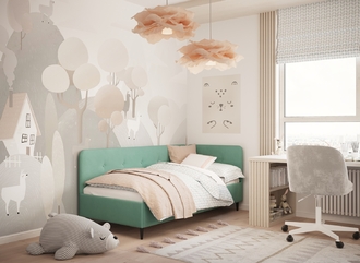 Угловая односпальная кровать MOON FAMILY 1253 с мягкой спинкой и изголовьем обладает округлыми формами, привносящими в интерьер нотки нежности. Изголовье, украшенное пуговицами, добавляет окружающему пространству шарм и уют. Высокие опоры придают кровати визуальной легкости, а также обеспечивают удобство во время уборки.